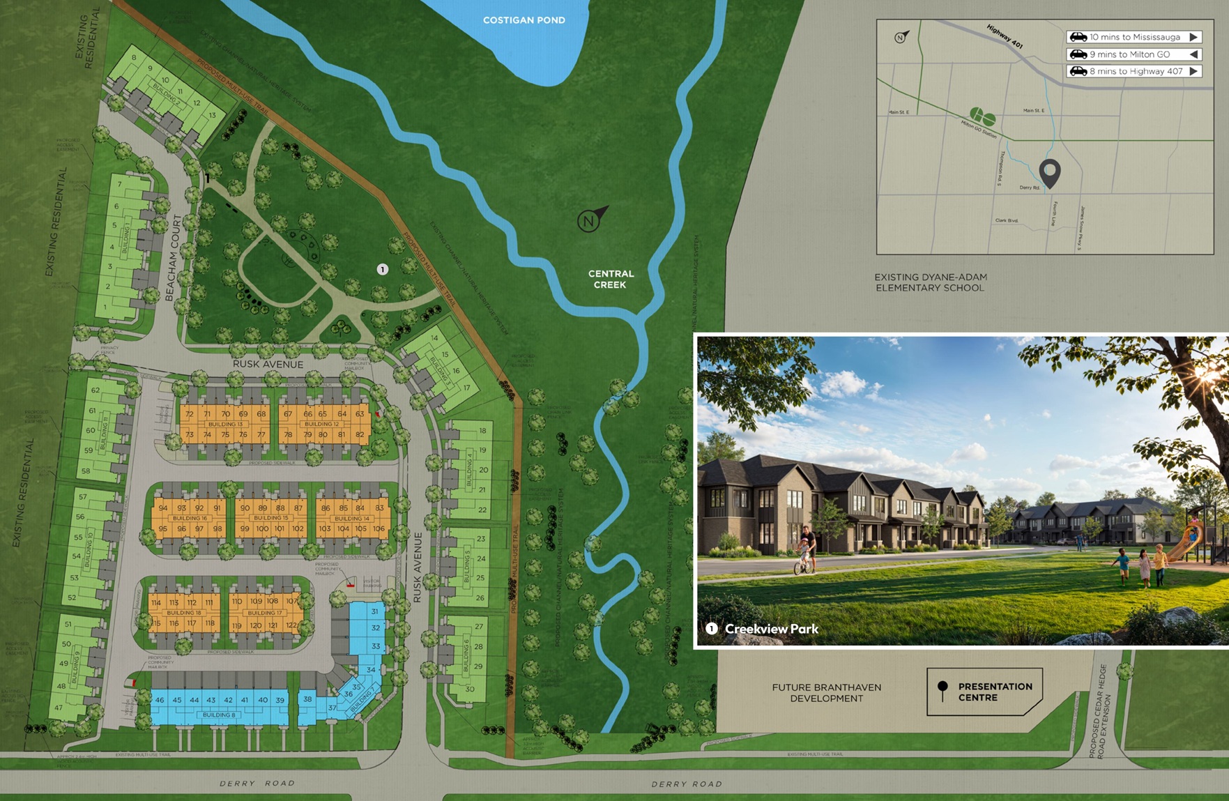 Located at Derry Rd W & Fourth Line, Creekview Collective offers seamless access to Highways 401 and 407, as well as Milton GO Station for direct transit to Mississauga, Oakville, and Downtown Toronto. Residents enjoy the perfect balance of connectivity and suburban tranquility.